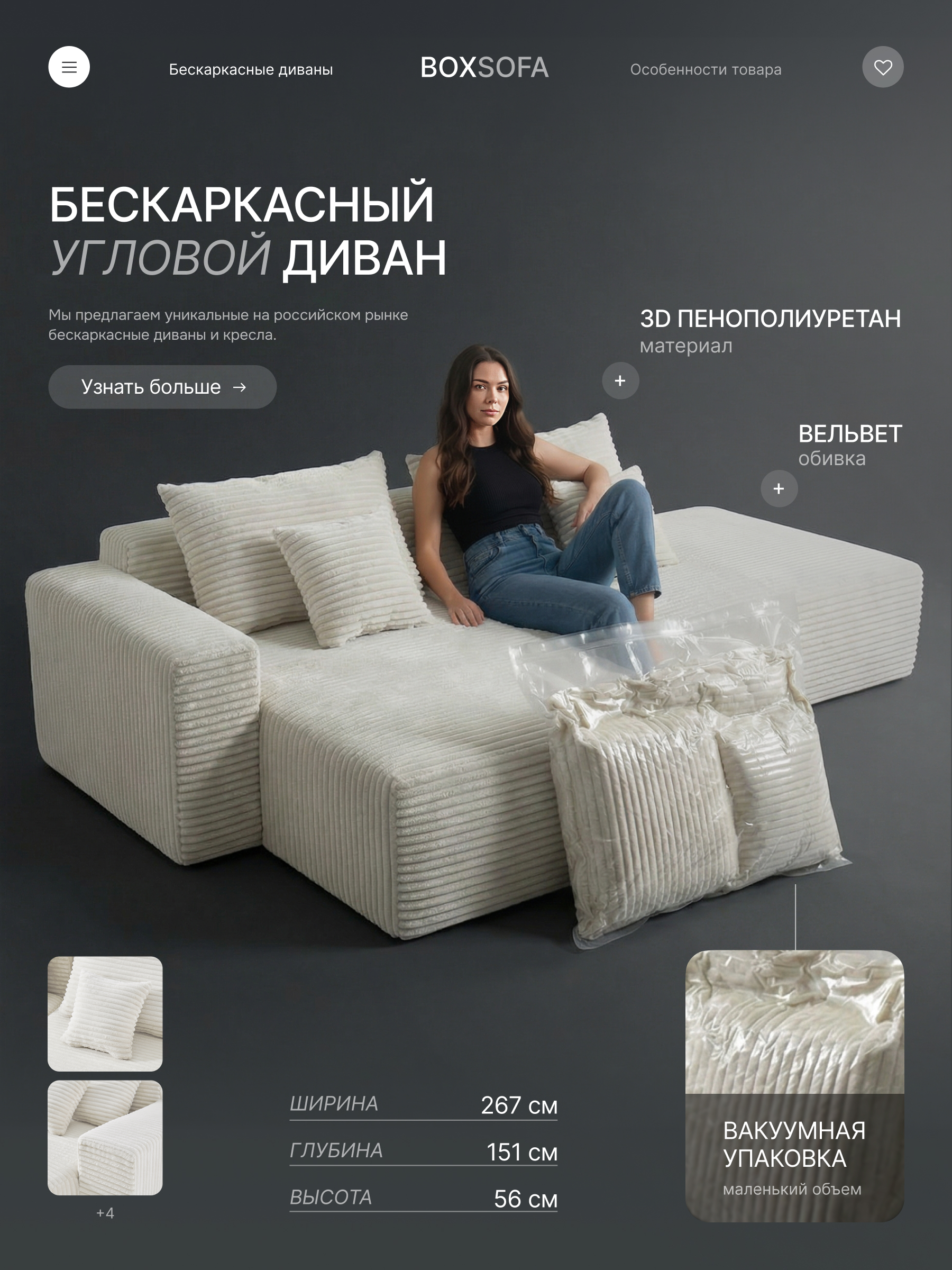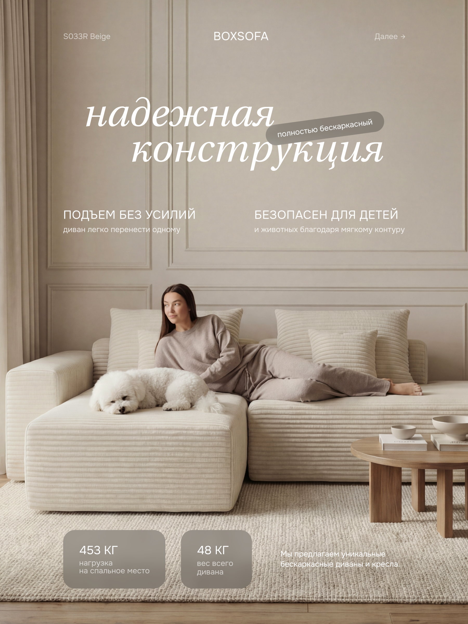 • Бескаркасный диван – идеальная анатомия покоя: бескаркасный диван из 3D-пенополиуретана повторяет контуры вашего тела, обеспечивая индивидуальную поддержку позвоночника. Он исключает точки давления, которые создают жесткие конструкции, гарантируя глубокое расслабление каждой мышцы.