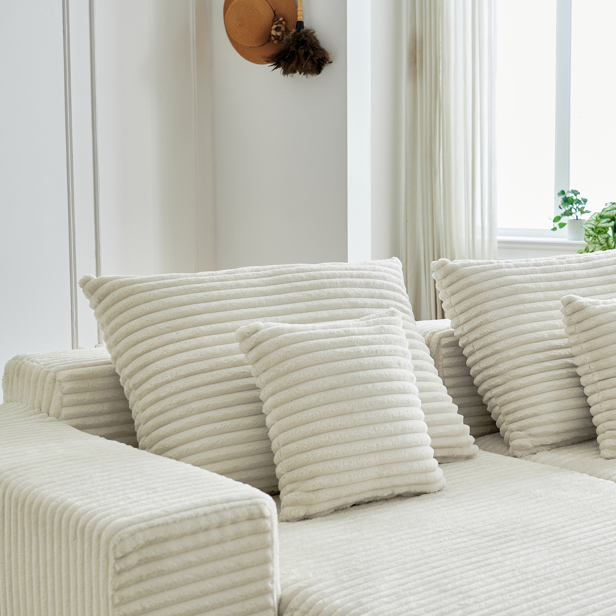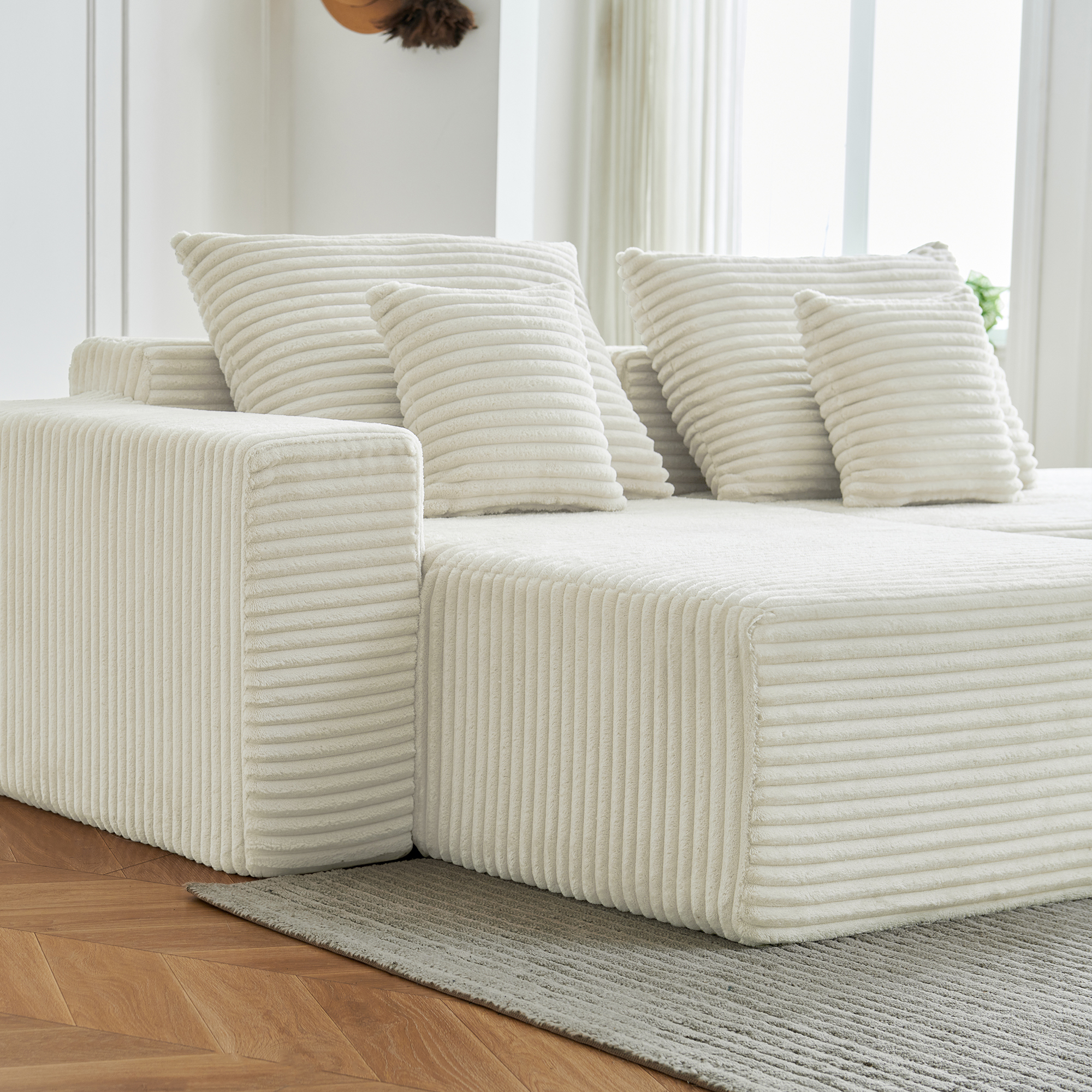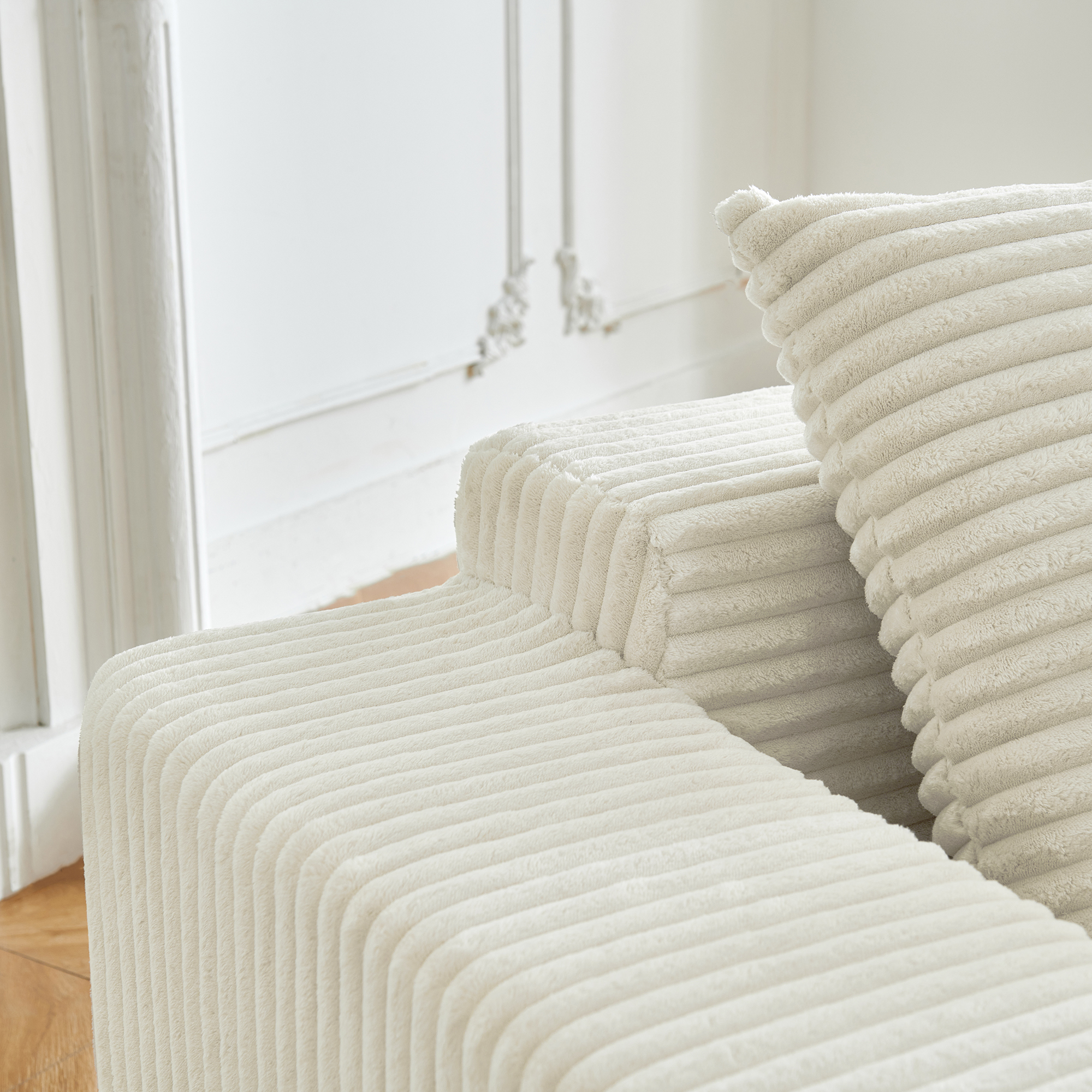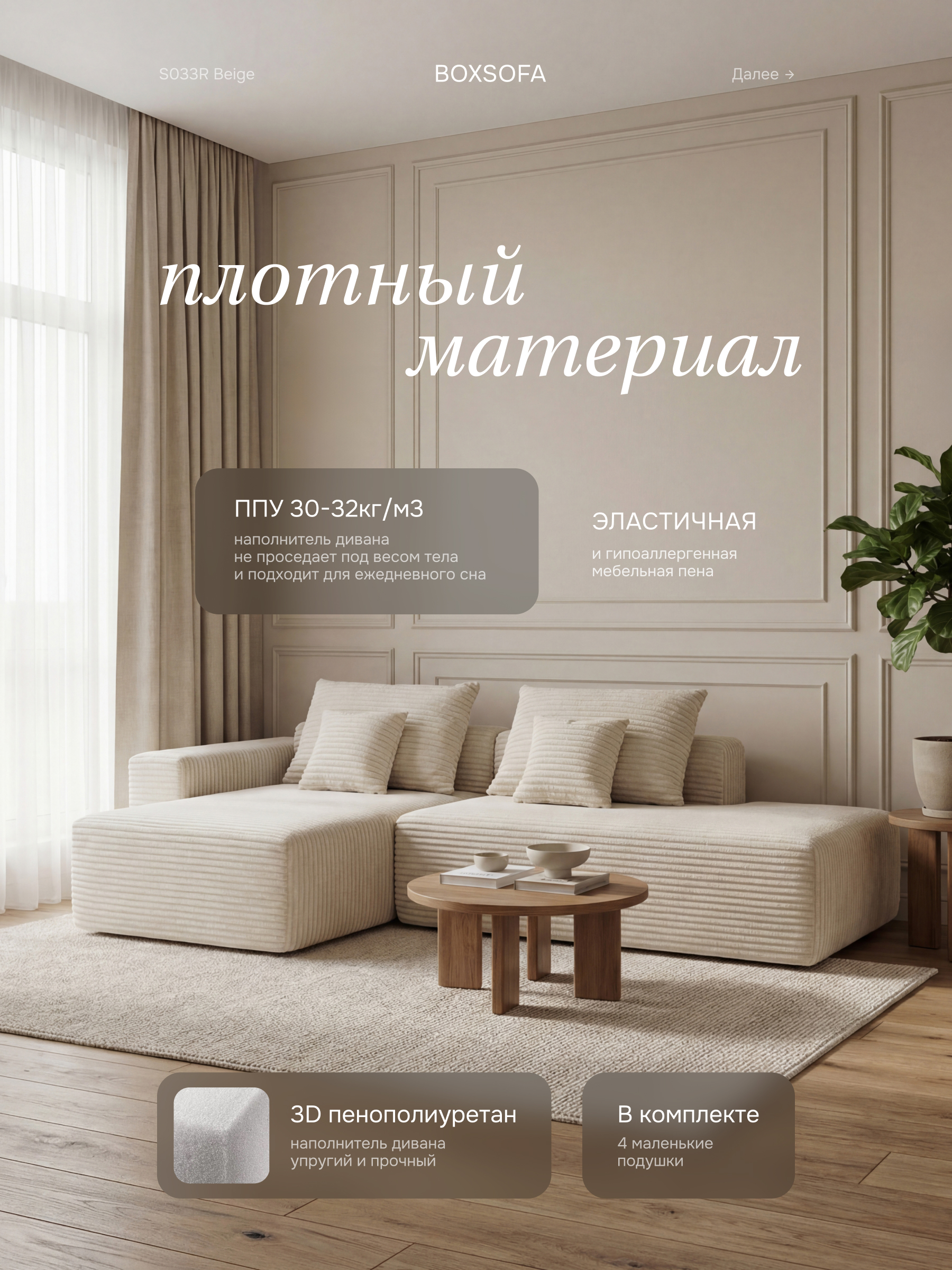 • Гармония обивки и цвета: бежевый вельвет — это тактильное тепло и свет: его ворс нежно контактирует с кожей, обеспечивая идеальную вентиляцию и прохладу. А бежевый цвет создаёт в пространстве мягкий, обволакивающий фон, который снижает визуальный шум и тревожность, позволяя почувствовать дом как идеальное убежище для отдыха и восстановления душевных сил.