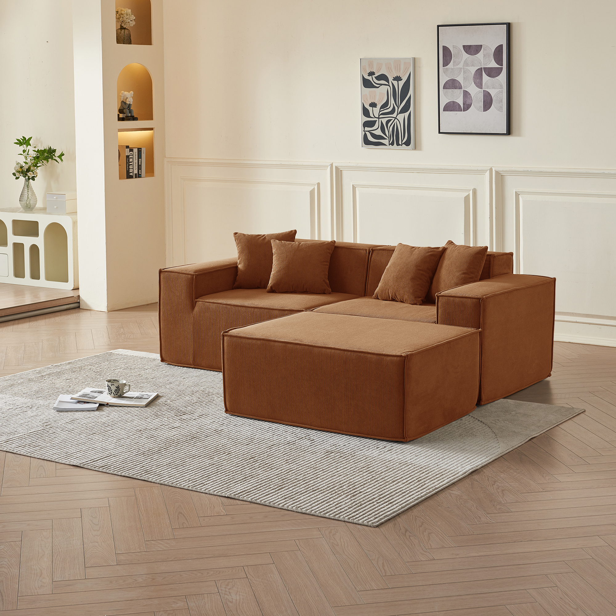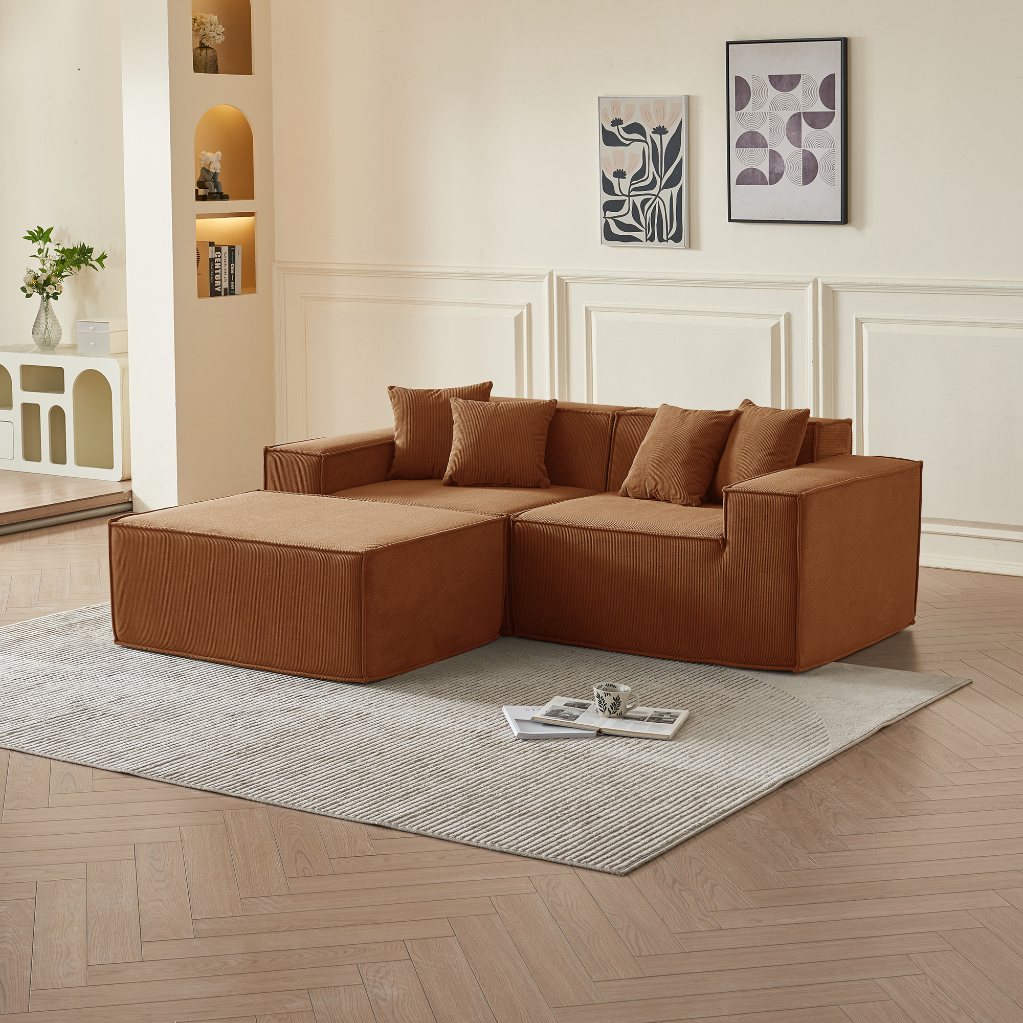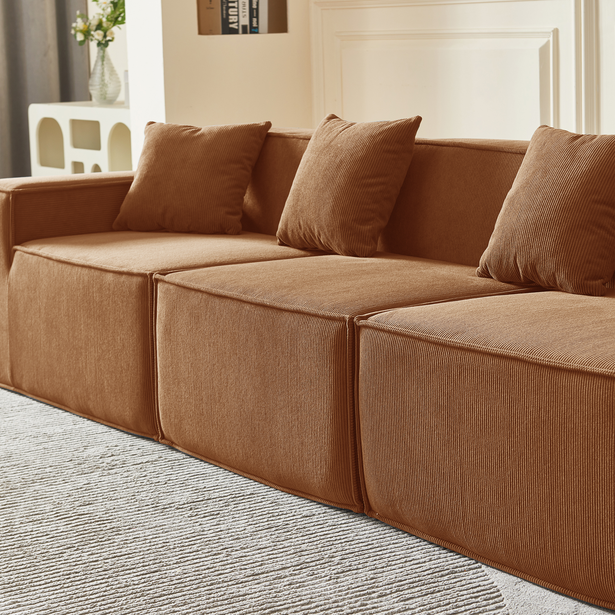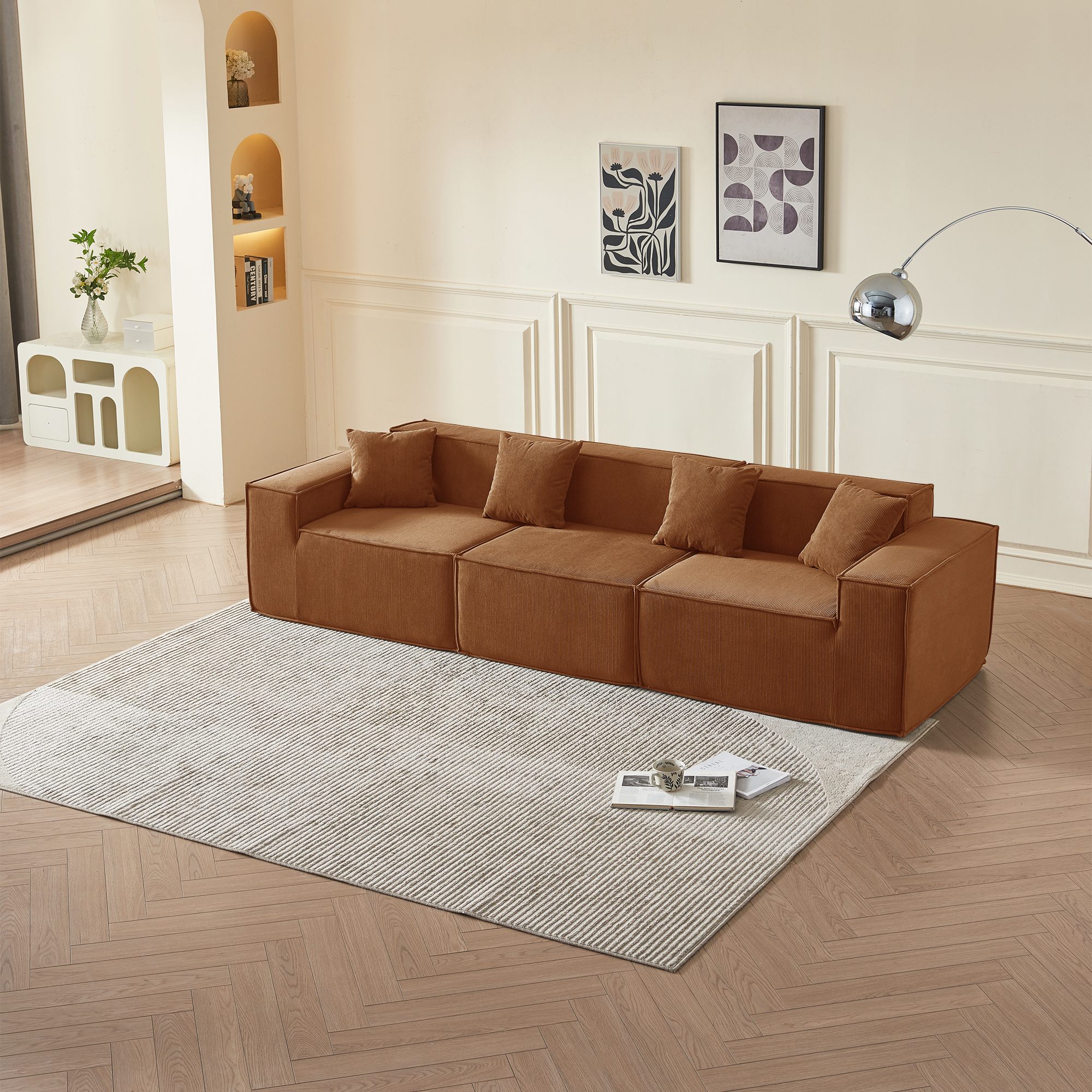 • Гармония обивки и цвета: оранжевый вельвет — это тактильное тепло и свет: его ворс нежно контактирует с кожей, обеспечивая идеальную вентиляцию и прохладу. В интерьере этот насыщенный, но не кричащий оттенок наполняет пространство атмосферой позднего осеннего солнца, создавая не броский, а глубинный акцент тепла, стабильности и гостеприимства, который успокаивает и настраивает на неторопливый отдых.